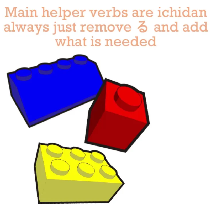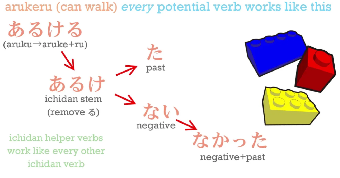donc le verbe auxiliaire potentiel, même lorsqu'il n'est que ce seul kana る(ru), est simplement un verbe ichidan régulier comme la plupart des verbes auxiliaires, et nous pouvons faire exactement les mêmes choses avec lui que nous pouvons faire avec d'autres verbes auxiliaires.