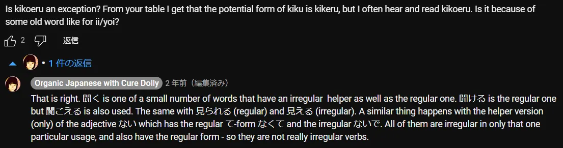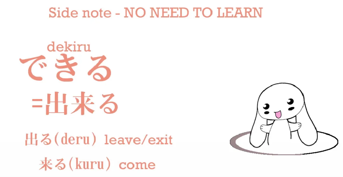– et c'est juste la façon dont できる est utilisé en japonais, n'est-ce pas ? Et il y a des façons intéressantes dont できる est utilisé qui montrent à quel point l'idée de quelque chose qui est possible et de quelque chose qui sort sont étroitement liées dans la langue japonaise. Mais nous n'en parlerons pas maintenant – c'est un peu plus avancé.