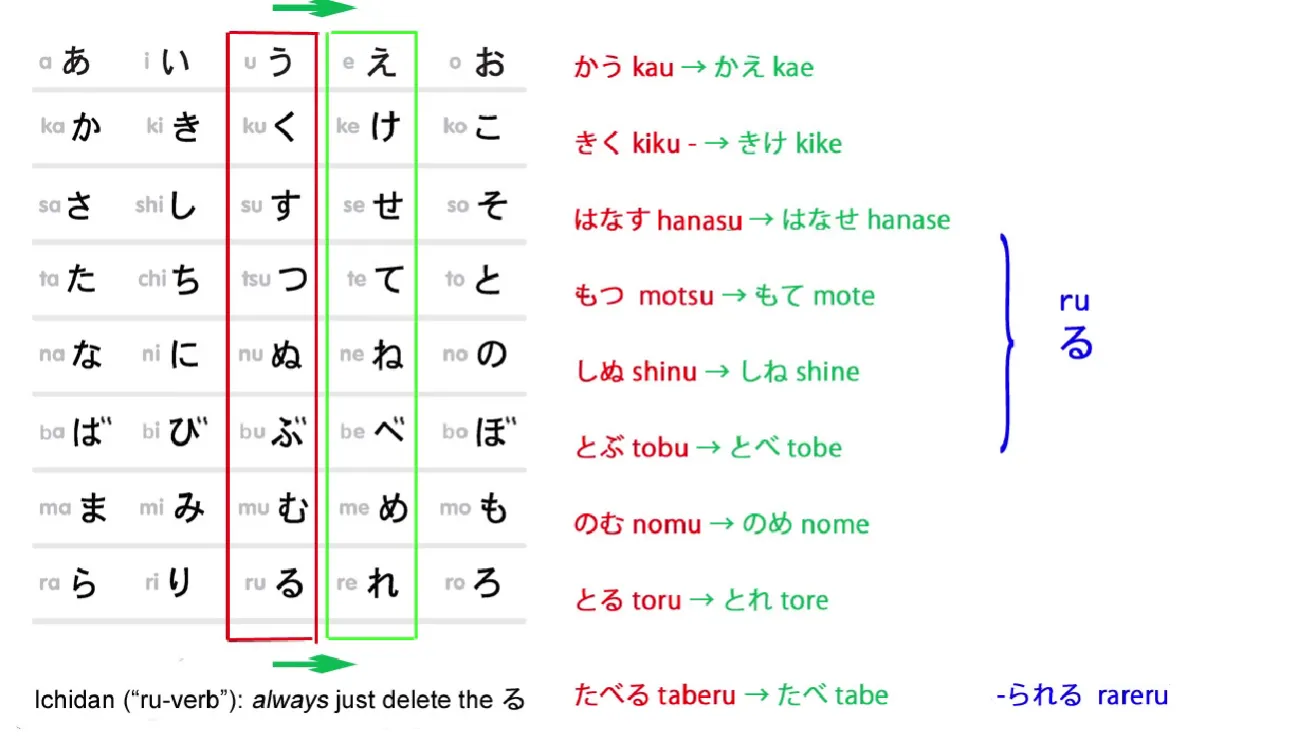 Il n'y a pas autant de choses que nous faisons avec la え-base qu'avec les bases あ et い, mais il y en a quelques-unes. Et un seul d'entre eux est un verbe, il n'y a donc pas de place pour la confusion ici. Le verbe auxiliaire potentiel a deux formes, et ce sont -る