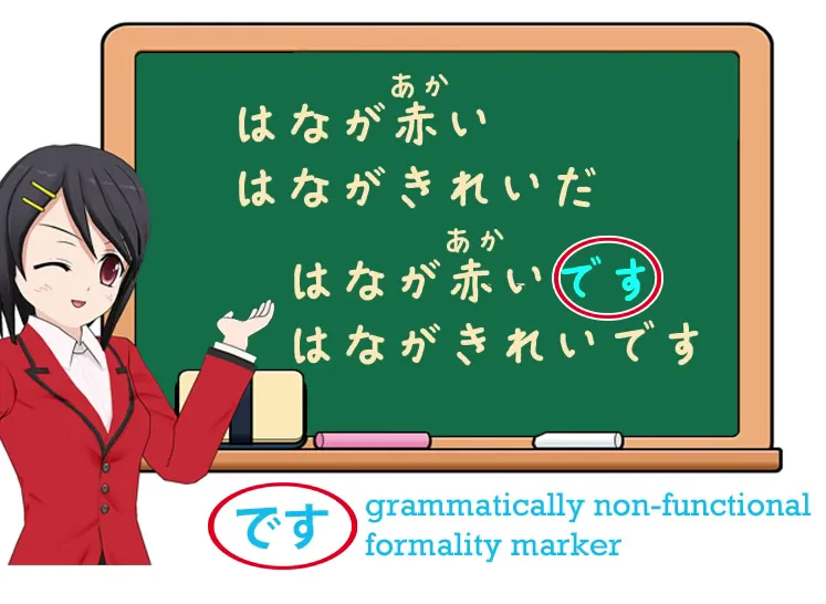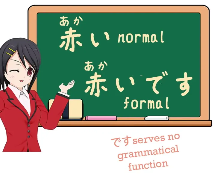 Cela ne fait rien ; cela décore simplement la phrase et la rend formelle. Encore une fois, c'est quelque chose que vous devez simplement apprendre et ce n'est pas très difficile à apprendre, mais si vous l'apprenez au début, vous avez l'impression que vous avez besoin de la copule avec un adjectif comme 赤い