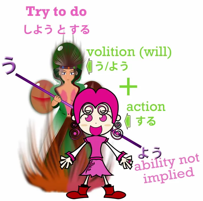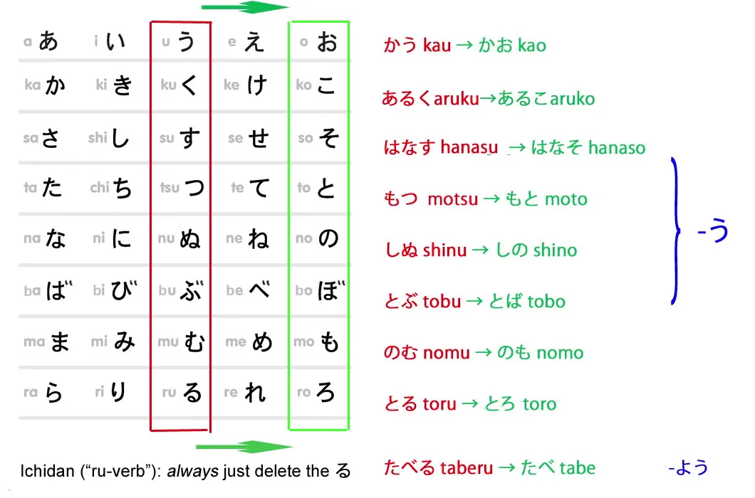 , car il s'agit d'une partie très centrale du japonais qui est utilisée tout le temps. Nous devons donc bien comprendre ce que c'est et comment cela fonctionne. Maintenant, la semaine dernière[17], nous avons appris l'auxiliaire volitionnel う et よう qui fait qu'un mot se termine par le son おう