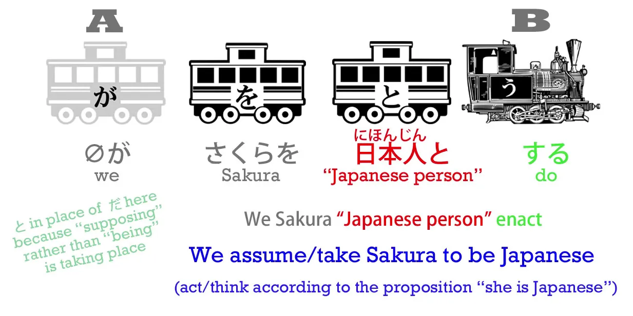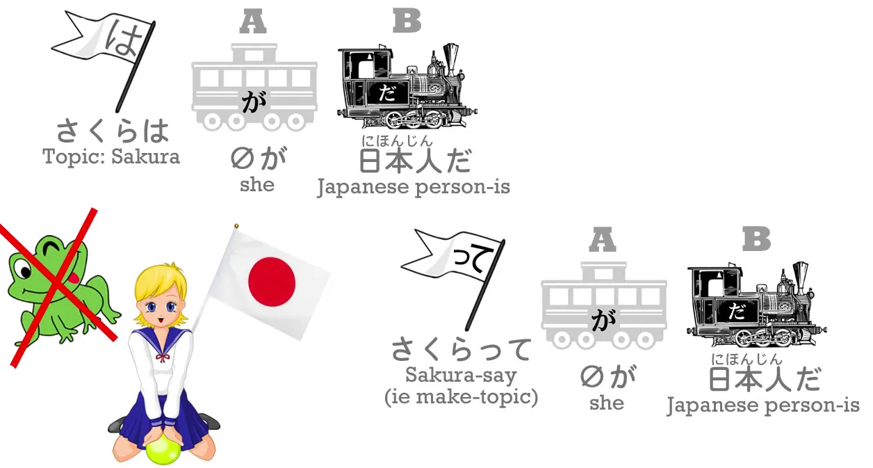 Maintenant, cela semble particulièrement étrange, jusqu'à ce que vous réalisiez ce que cela fait réellement. Si nous nous souvenons de ce qu'est la particule は, la particule は est la particule de marquage du thème. Donc, lorsque nous disons さくらは *(zeroが)* 日本人だ