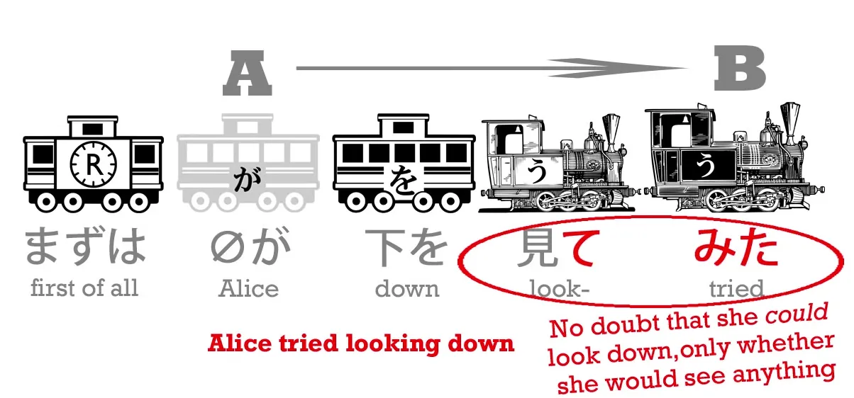 En japonais, comme nous l'avons appris récemment[16], si nous voulons dire, **essayer de** grimper la montagne