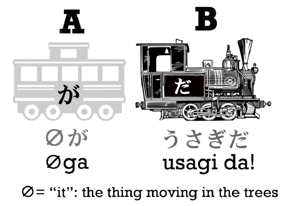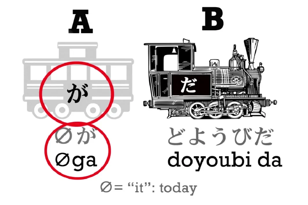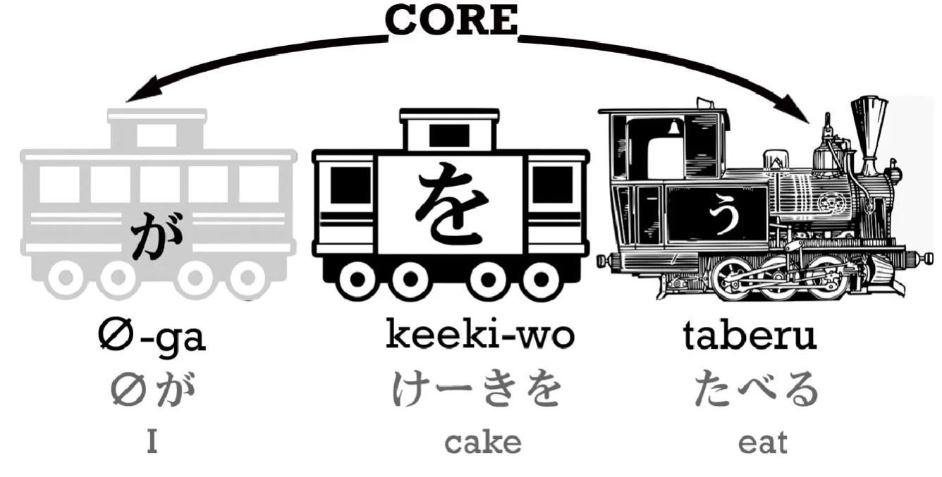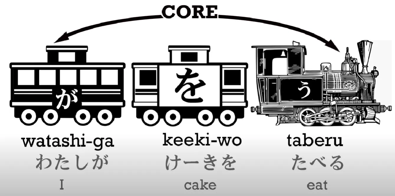 Dans la leçon précédente, nous avons appris que chaque phrase japonaise a le même noyau : le wagon principal et la locomotive, également appelés A et B, ou encore la chose dont nous parlons et ce que nous disons à son sujet. Je vous ai expliqué que l’on peut avoir beaucoup plus de wagons à mesure que les phrases deviennent plus complexes, mais qu’elles conservent toujours le même noyau.