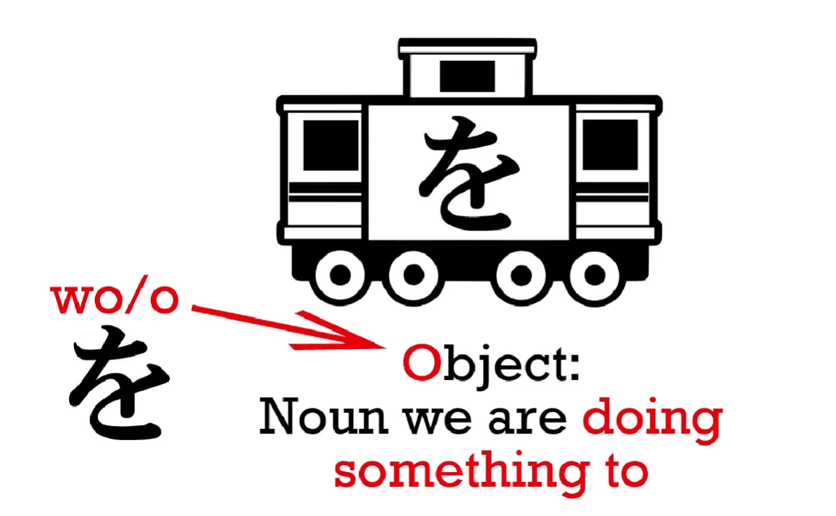 Je vais vous présenter un autre type de wagon : le wagon を. Cela signifie un nom marqué par la particule を, prononcé o