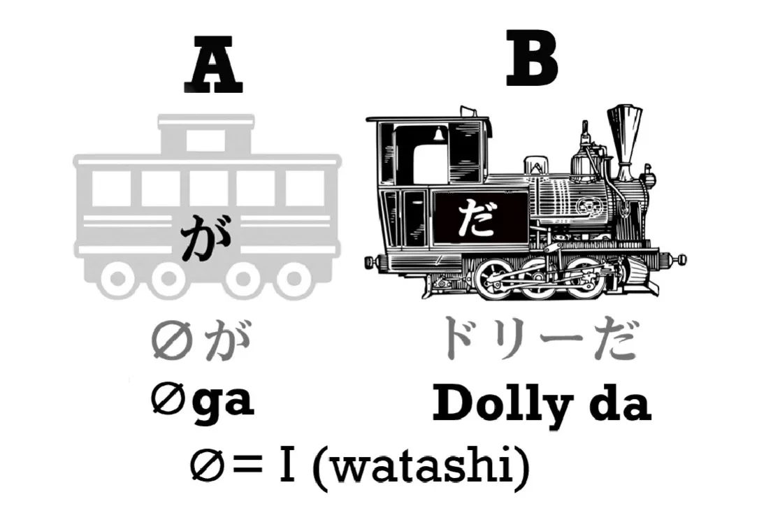 . Au premier abord, on dirait qu’il n’y a que la locomotive et pas de wagon principal, mais en réalité le wagon principal est simplement le wagon invisible. La phrase complète est en fait : (**zeroが**)ドリーだ