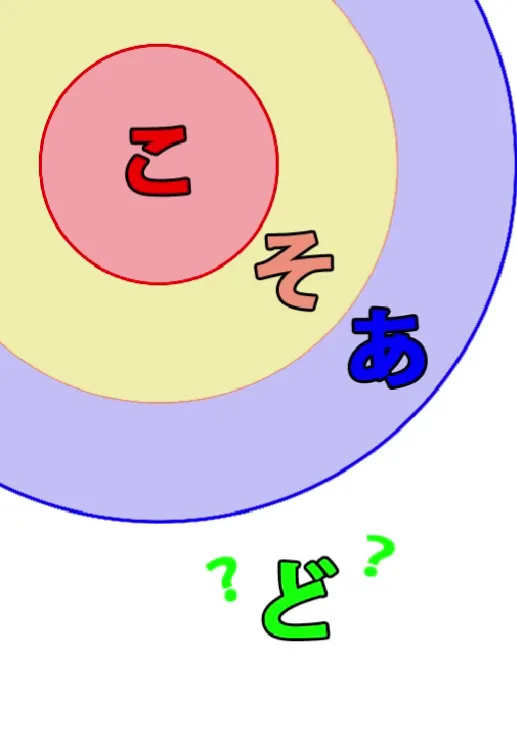 Nous voyons donc que le système こ-そ-あ-ど fonctionne à la fois en termes d'emplacement littéral et en termes d'emplacement métaphorique.