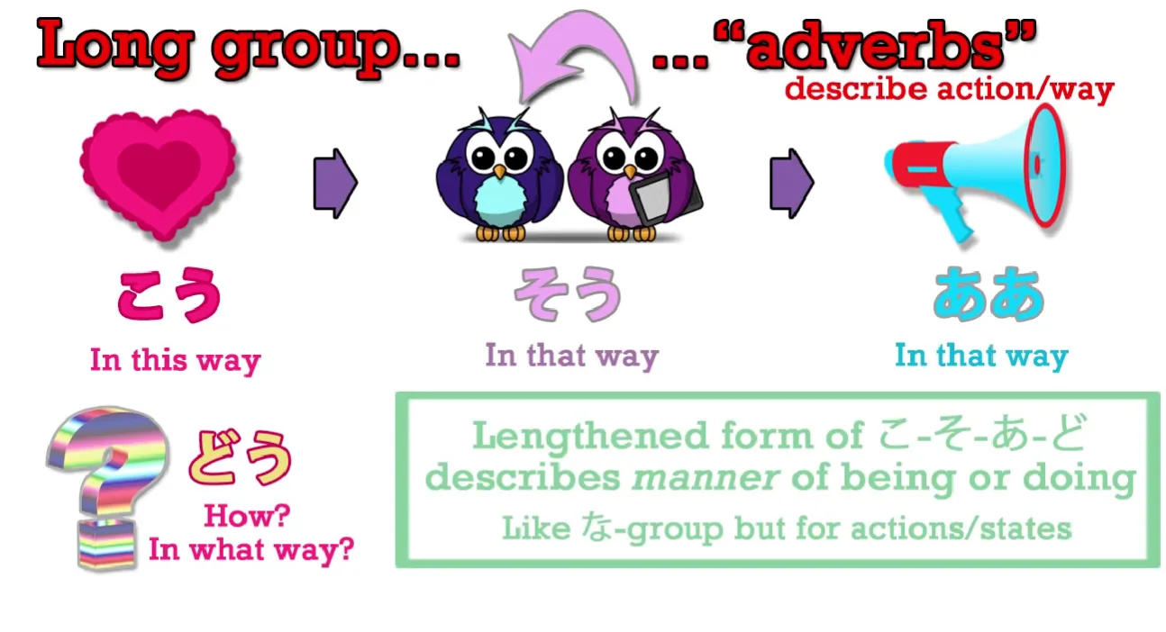 Maintenant, lorsque nous utilisons こ-そ-あ-ど seuls et que nous les allongeons avec -う (ou dans le cas de あ-, avec un -あ supplémentaire) de sorte qu'ils deviennent こう