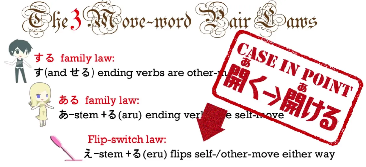 , qui est le verbe régulier en う se terminant par く / ける : え-stem + -る de la troisième loi des verbes de mouvement propre/mouvement d'autrui que nous avons déjà examinée.[15]