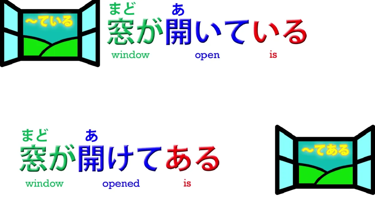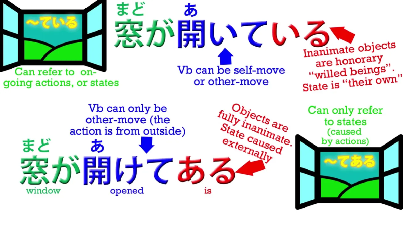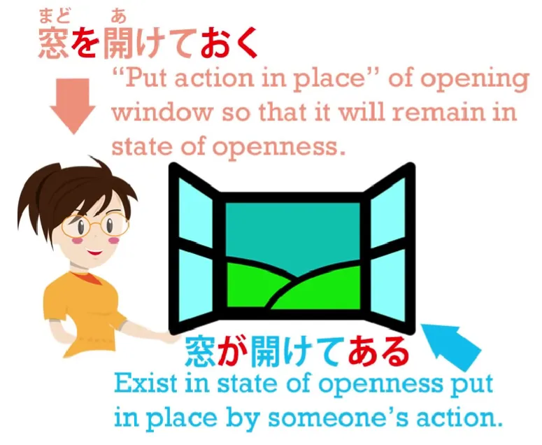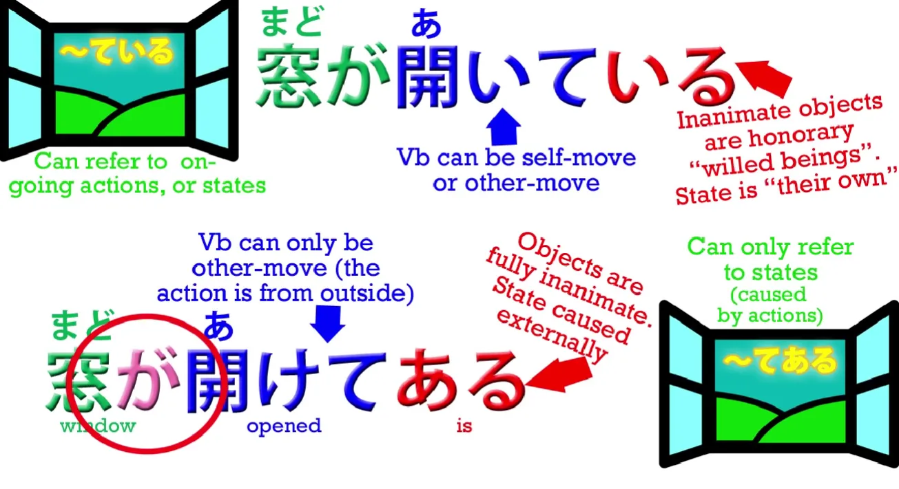 , nous disons que quelqu'un a ouvert la fenêtre. La fenêtre était le simple objet d'avoir été ouverte par quelqu'un d'autre. Elle perd donc son statut d'être animé honoraire. Elle est traitée comme un simple objet, une chose inanimée – 開け**てある**