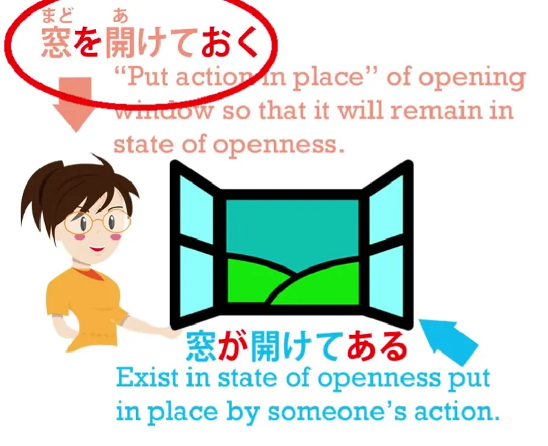 signifie mettre l'action en place. Maintenant, dans cette utilisation particulière, c'est assez facile à voir car elle met littéralement le pot en place et elle met cette action en place. Ce que les manuels et les sites Web vous disent, c'est que cela signifie faire quelque chose à l'avance, faire quelque chose dans le but de quelque chose d'autre. Et c'est vrai dans de nombreux cas. C'est probablement le plus proche que vous puissiez obtenir en français. Mais ce que cela signifie réellement, c'est mettre l'action en place. Et pour comprendre cela, revenons à notre exemple 窓が開けてある