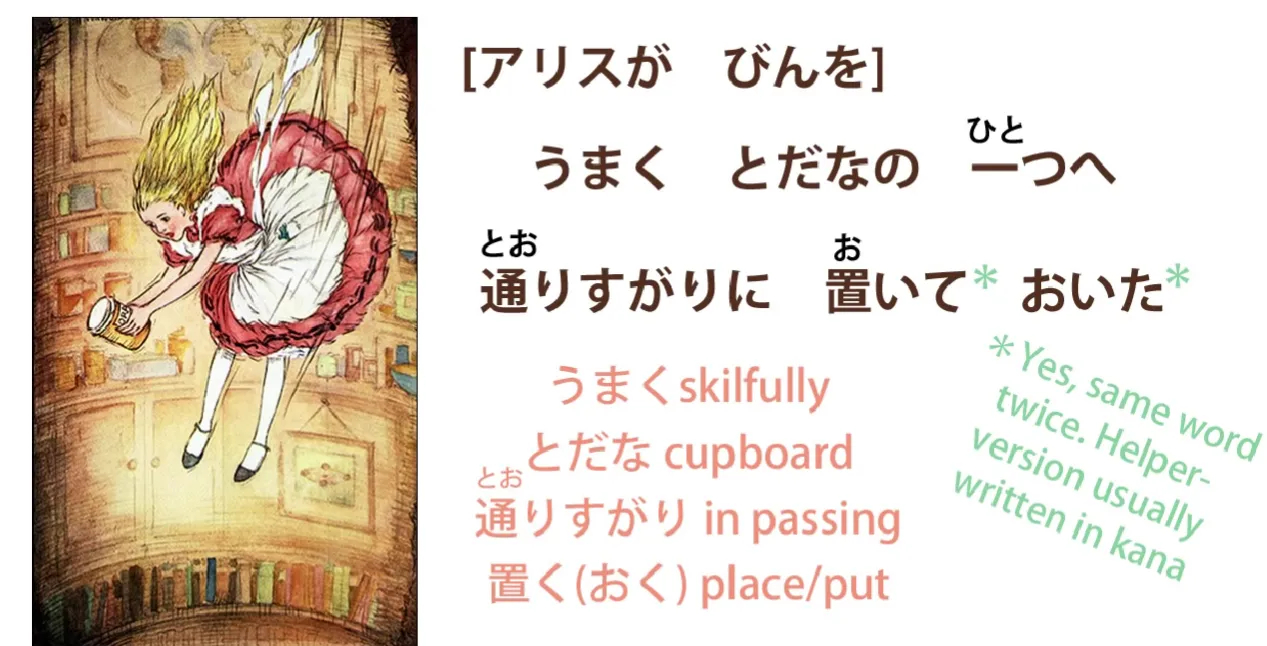 Aujourd'hui, nous allons revenir aux aventures d'Alice, et nous allons les utiliser comme une occasion d'examiner certaines des utilisations plus profondes et plus subtiles de la て-forme. Celles-ci sont couvertes dans les manuels réguliers et les sites Web d'apprentissage du japonais, mais comme d'habitude, ils n'expliquent pas la logique qui les sous-tend, ce qui les rend plus difficiles à saisir. Et dans certains cas où il n'y a pas d'équivalent français simple, ils ne vous disent vraiment pas ce qui se passe réellement, car ils ne parlent qu'en termes d'équivalents français, ce qui vous laisse deviner une bonne partie du temps.
