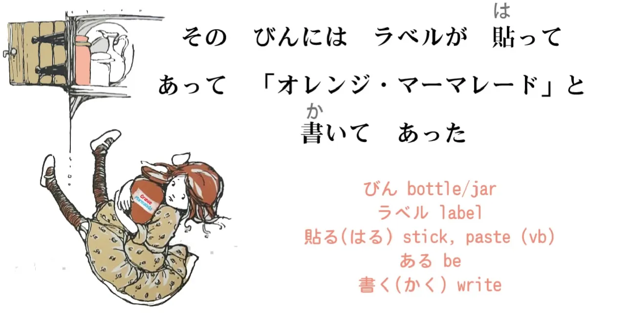 Et c'est la même chose qui se passe dans notre phrase d'Alice. そのびんには**ラベルが貼ってあって**