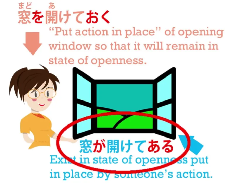 – la fenêtre reste ouverte parce que quelqu'un l'a mise là.**窓を**開け**ておく**