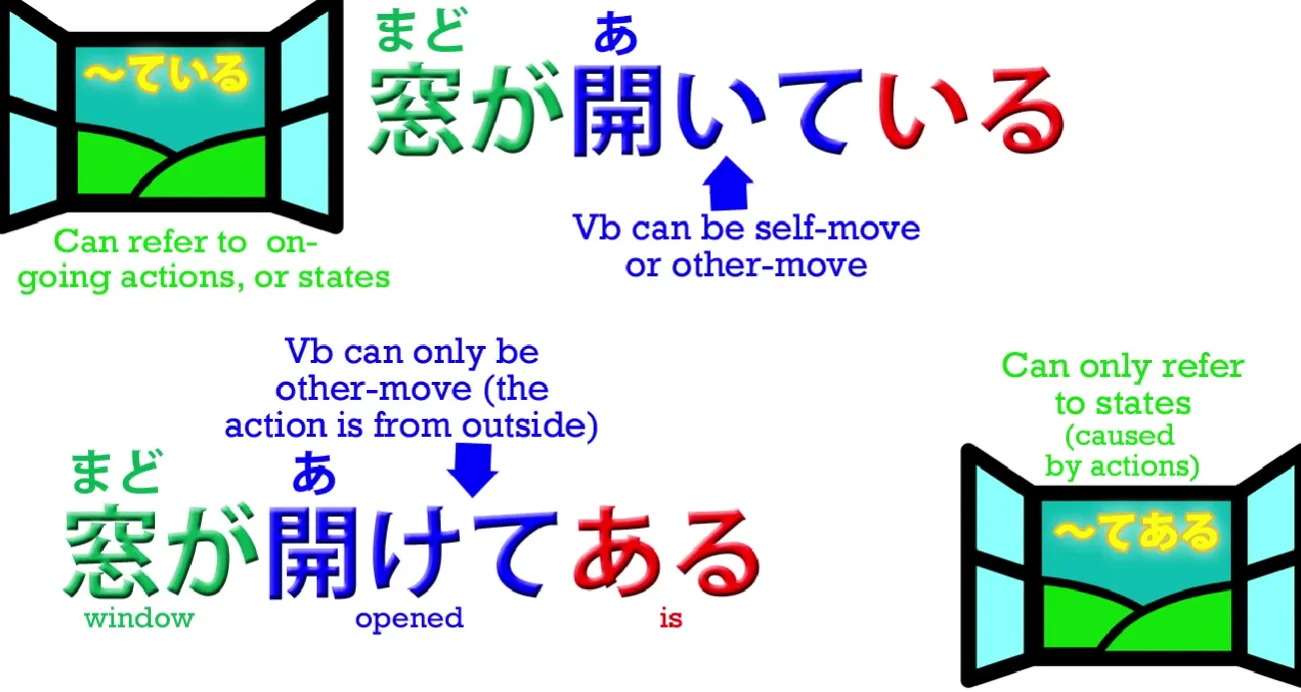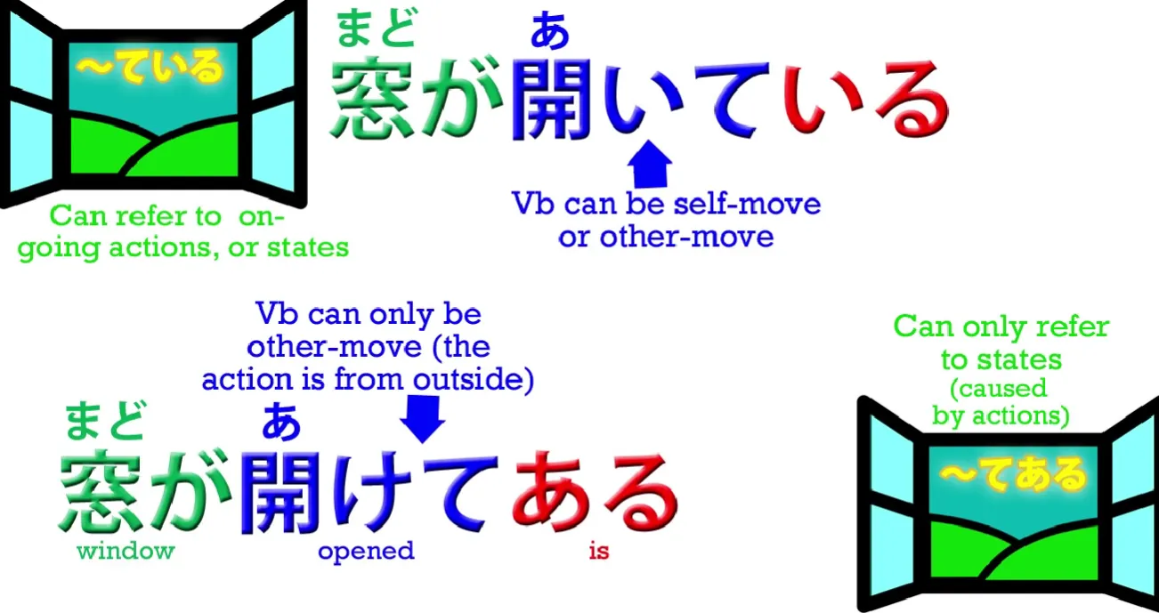 signifie, c'est que la fenêtre était ouverte, mais elle était ouverte parce que quelqu'un d'autre l'a ouverte. Nous signalons cela en premier lieu en utilisant la version de mouvement d'autrui du verbe et en second lieu en utilisant ある