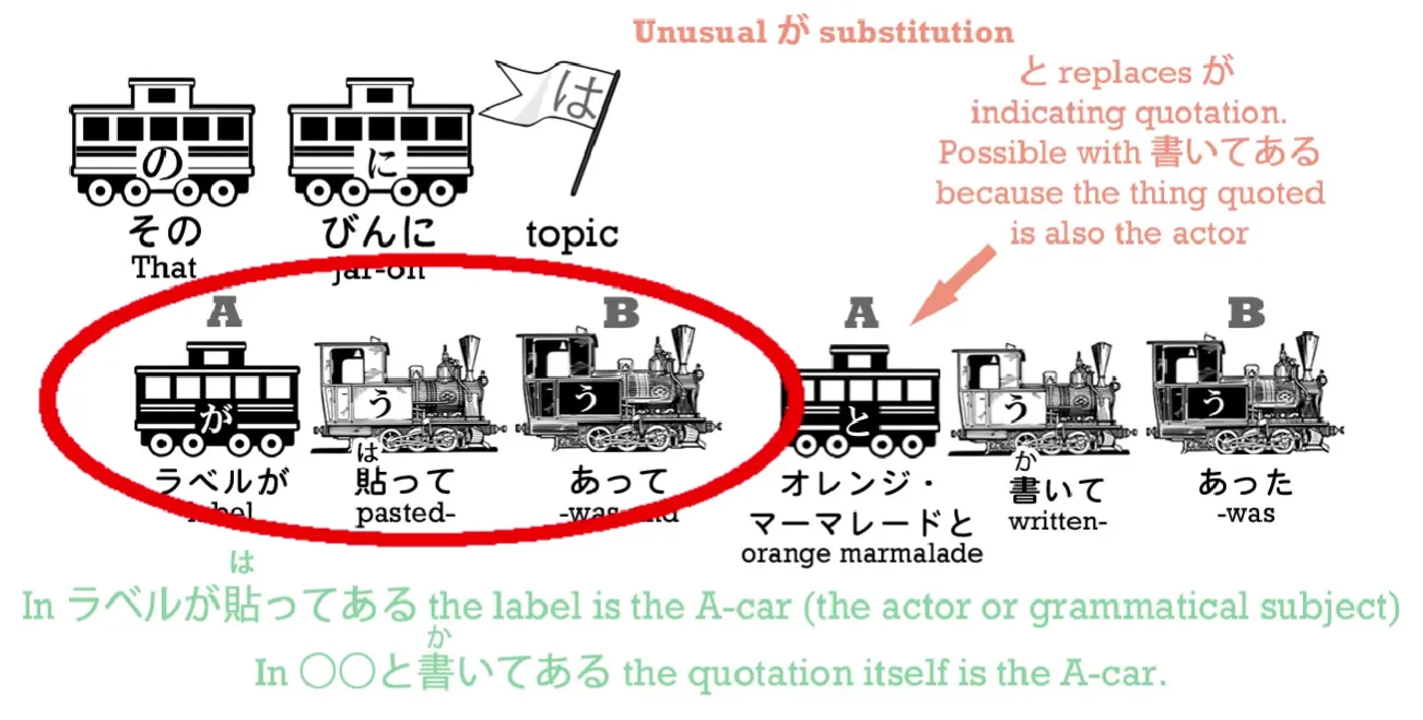 . Et chaque fois que nous parlons de quelque chose qui est écrit sur quelque chose, nous avons tendance à utiliser cette forme. Nous ne disons pas "L'étiquette disait 'Marmelade à l'Orange****'", ce que nous disons en français, comme si l'étiquette pouvait parler. Nous disons 「オレンジ・マーマレード」と**書いてあった**