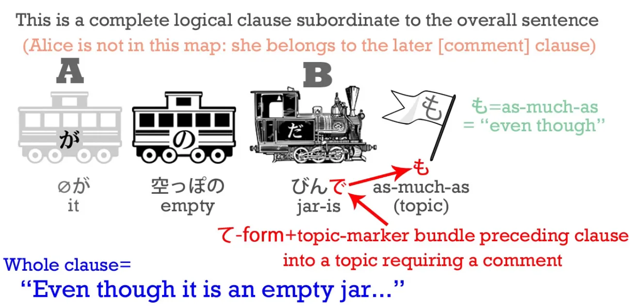, et も, comme nous le savons, est la sœur additive et inclusive de は : la particule additive, inclusive et non logique marquant le thème. Ainsi, 空っぽのびん**でも**
