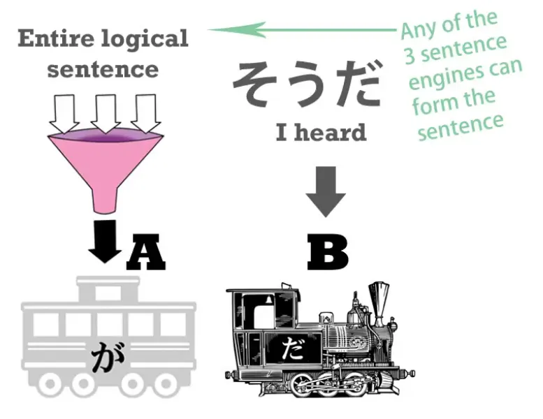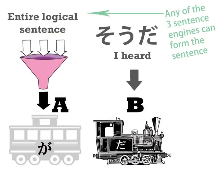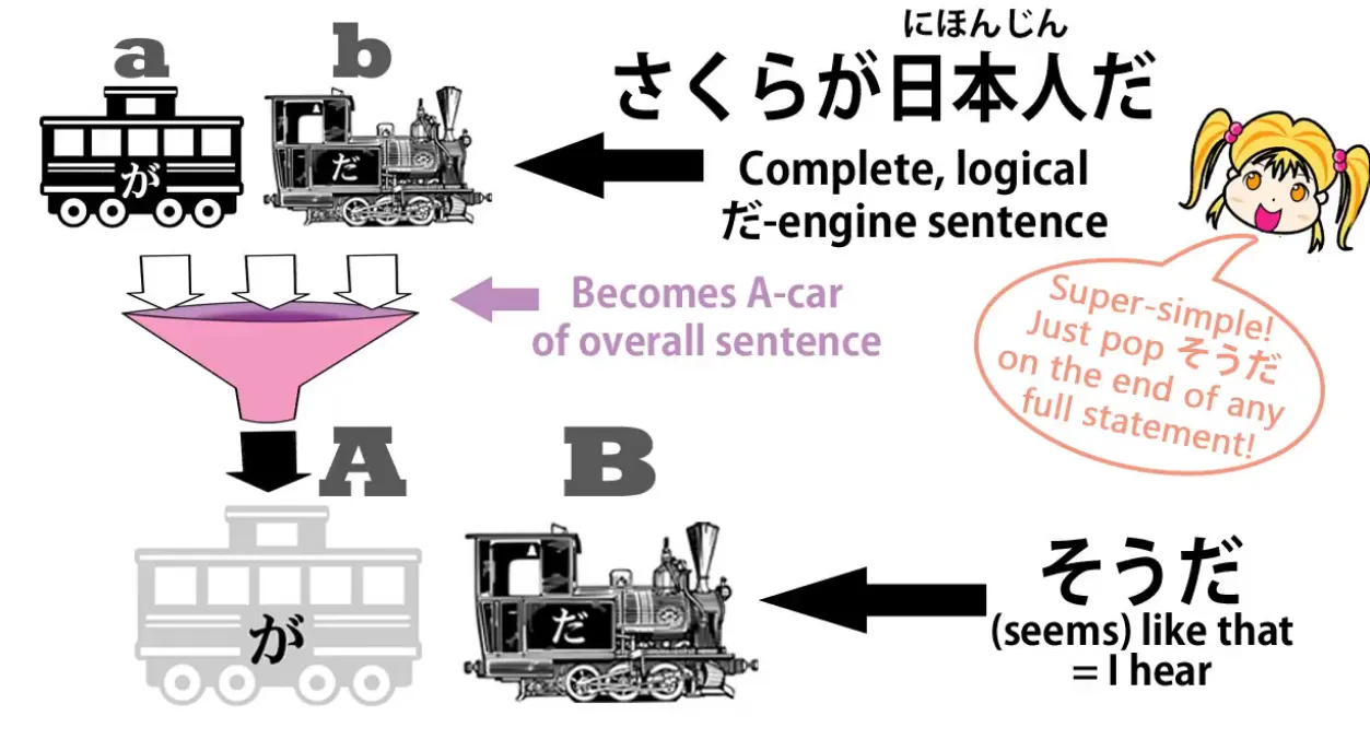 La phrase complète devient donc le wagon A de la phrase et le そうだ devient le moteur B. Et le contenu de la phrase est maintenant subordonné. Prenons un exemple :