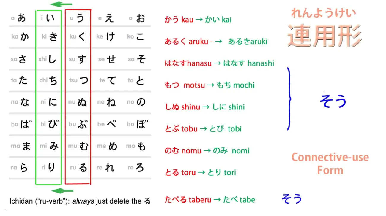 Et la base en い est ce que vous pourriez appeler la base pure d'un verbe. En japonais, on l'appelle れんようけい/連用形, ce qui signifie forme d'utilisation connective. Et cela pourrait sembler étrange car nous savons que les quatre bases connectent en fait des choses, mais alors que les trois autres ont des utilisations particulières, la れんようけい/連用形, la base en い, en plus de ses utilisations particulières, peut être utilisée pour connecter presque n'importe quoi. Elle peut connecter des verbes à des noms pour former de nouveaux noms ; elle peut relier des verbes à des verbes pour former de nouveaux verbes ; et ainsi de suite.