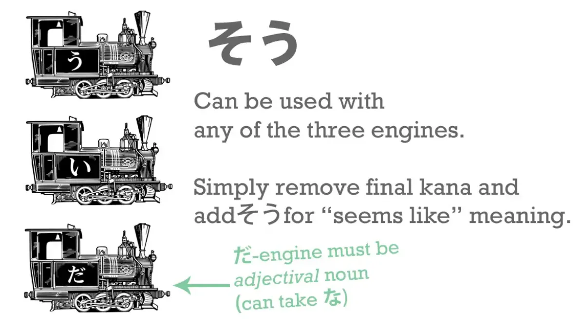 Et rappelez-vous, comme nous l'avons appris précédemment, que chacun des trois moteurs peut être déplacé derrière d'autres wagons pour les transformer en adjectifs.[6] Or, une fois que -そう a été attaché à un moteur, le moteur devient un nouveau nom adjectival. Comment les attachons-nous ? Nous faisons la même chose dans tous les cas. Nous prenons le dernier kana du moteur. C'est le kana qui le rend ce qu'il est, sa partie active.