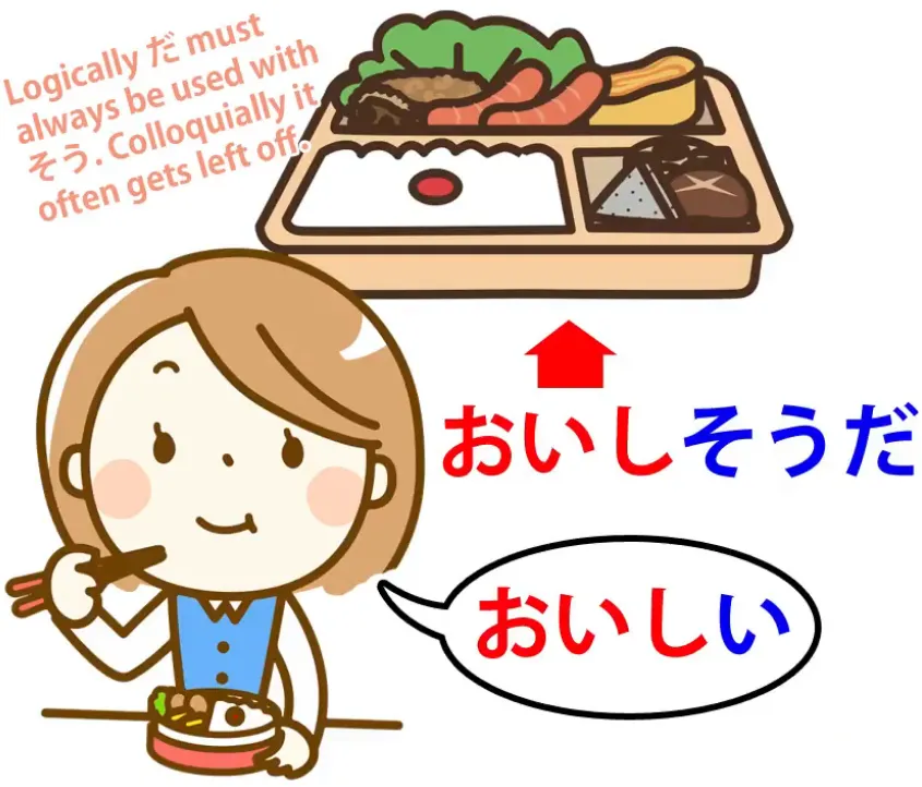Donc, si nous prenons 面白い (intéressant-est ou amusant-est), おいしい (délicieux-est), nous coupons simplement le -い et ajoutons -そう. Ainsi, 面白い signifie intéressant-***est*** ou amusant-***est***, 面白**そう** signifie **semble** intéressant / **semble** amusant. おいしい signifie délicieux / savoureux-est, おいし**そう** signifie qu'il **a l'air** délicieux, il **a l'air** savoureux. Et c'est important à retenir car, comme nous l'avons mentionné précédemment, le japonais est beaucoup plus strict que le français pour nous restreindre à dire uniquement des choses que nous pouvons réellement savoir par nous-mêmes.