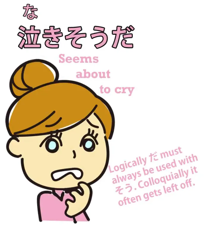 Ainsi, 雨が降り**そうだ** signifie on dirait qu'il **est sur le point** de pleuvoir. 子どもが泣き**そう*(だ)*** signifie L'enfant **a l'air** d'être sur le point de pleurer / **semble** être sur le point de pleurer. Et si vous regardez, c'est assez similaire à ce que nous pourrions dire en français : Ça **ressemble à** de la pluie / on **dirait qu'**il est sur le point de pleuvoir. Ces utilisations sont donc vraiment assez simples.