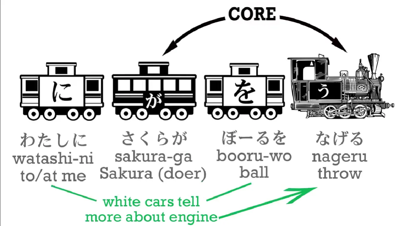 Elle ne peut pas non plus être un wagon blanc, car les wagons blancs comme la particule を (wo) font partie de la structure logique de la phrase.