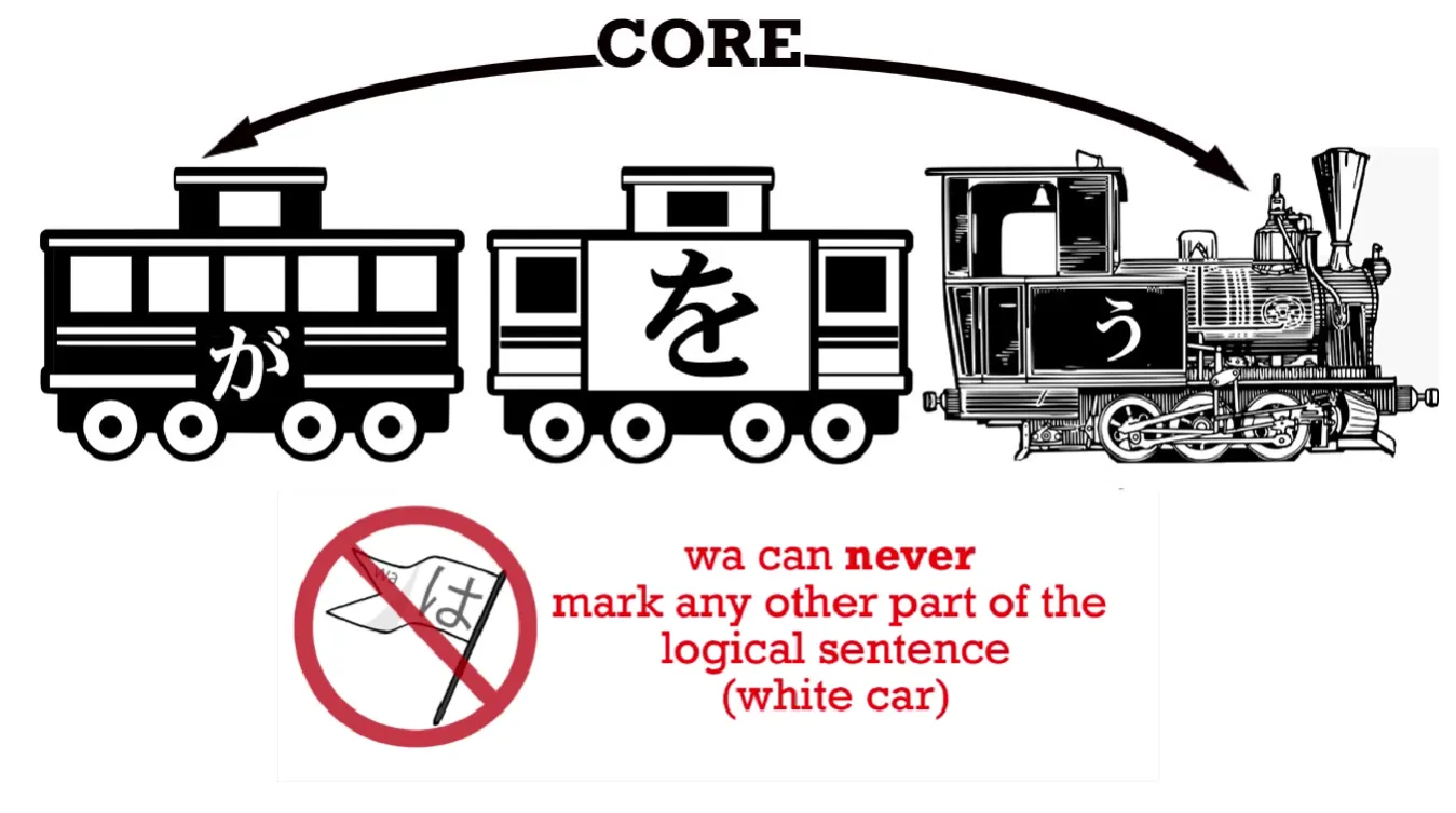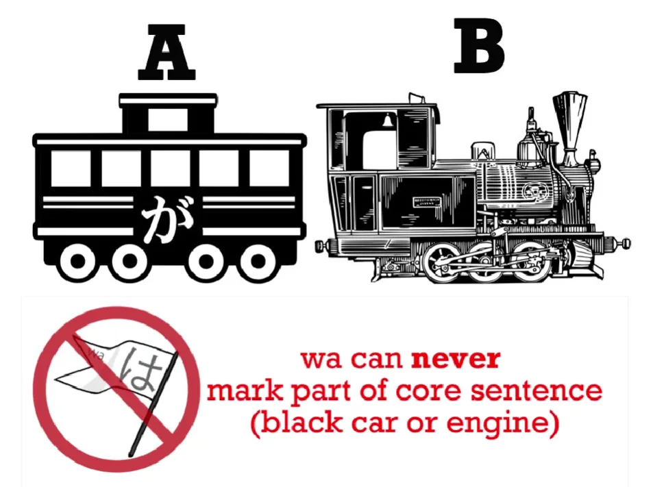 Cependant, nous sommes maintenant prêts à examiner la particule は et à découvrir ce qu'elle fait et, tout aussi important, ce qu'elle ne fait pas. La particule は ne peut jamais faire partie de la phrase centrale. Elle ne peut jamais être l’un des wagons noirs, le wagon principal A (la chose dont on parle) ou le moteur B (la chose dont on parle à propos de A).