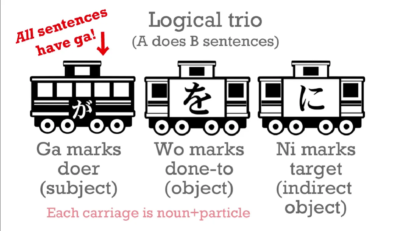 Le wagon que nous allons introduire aujourd'hui est un wagon blanc, et c’est le wagon に (ni). Il forme un trio avec が (ga) et を (wo). Dans les phrases A fait B