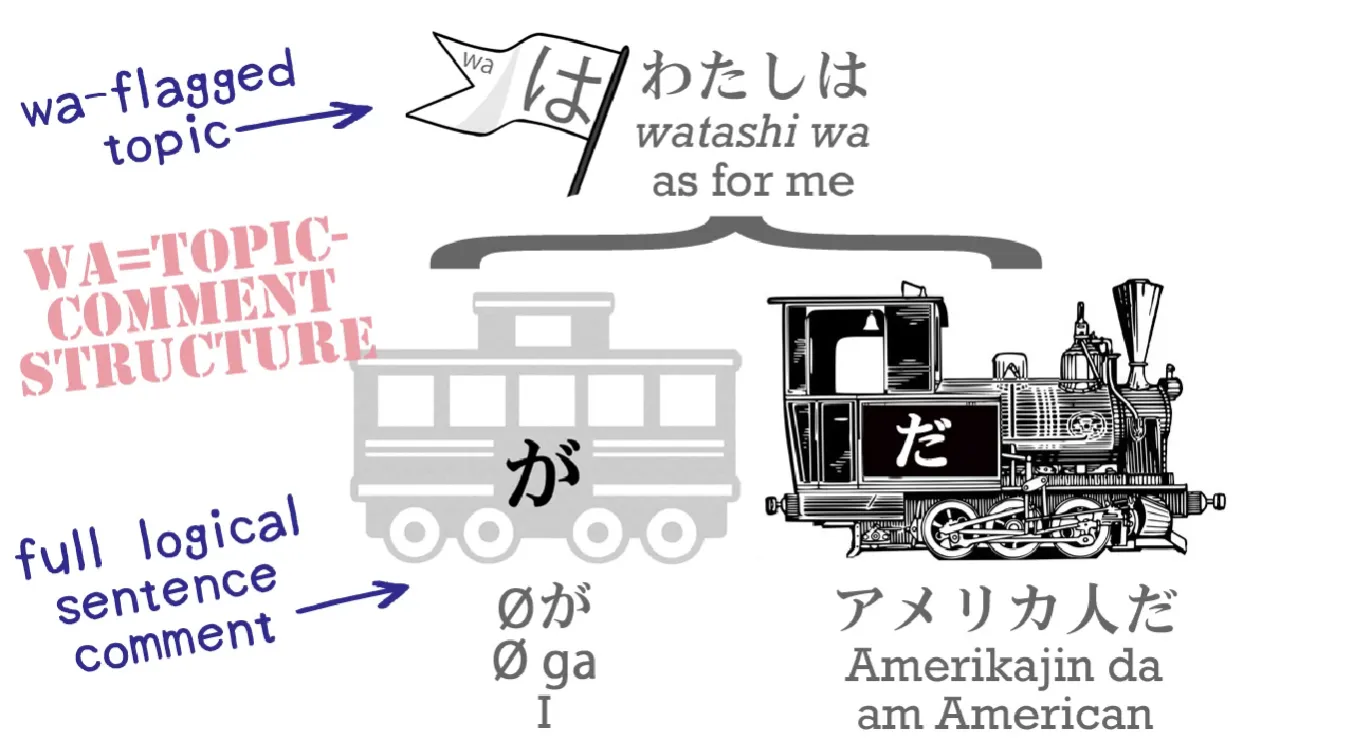 Exactement, c’est un drapeau. Pourquoi le représentons-nous comme un drapeau ? Parce que c’est ce que fait は. Il signale quelque chose comme le sujet de la phrase. Il ne dit rien à son sujet. C’est la phrase logique qui sert à cela. Wa ne fait que signaler le sujet.