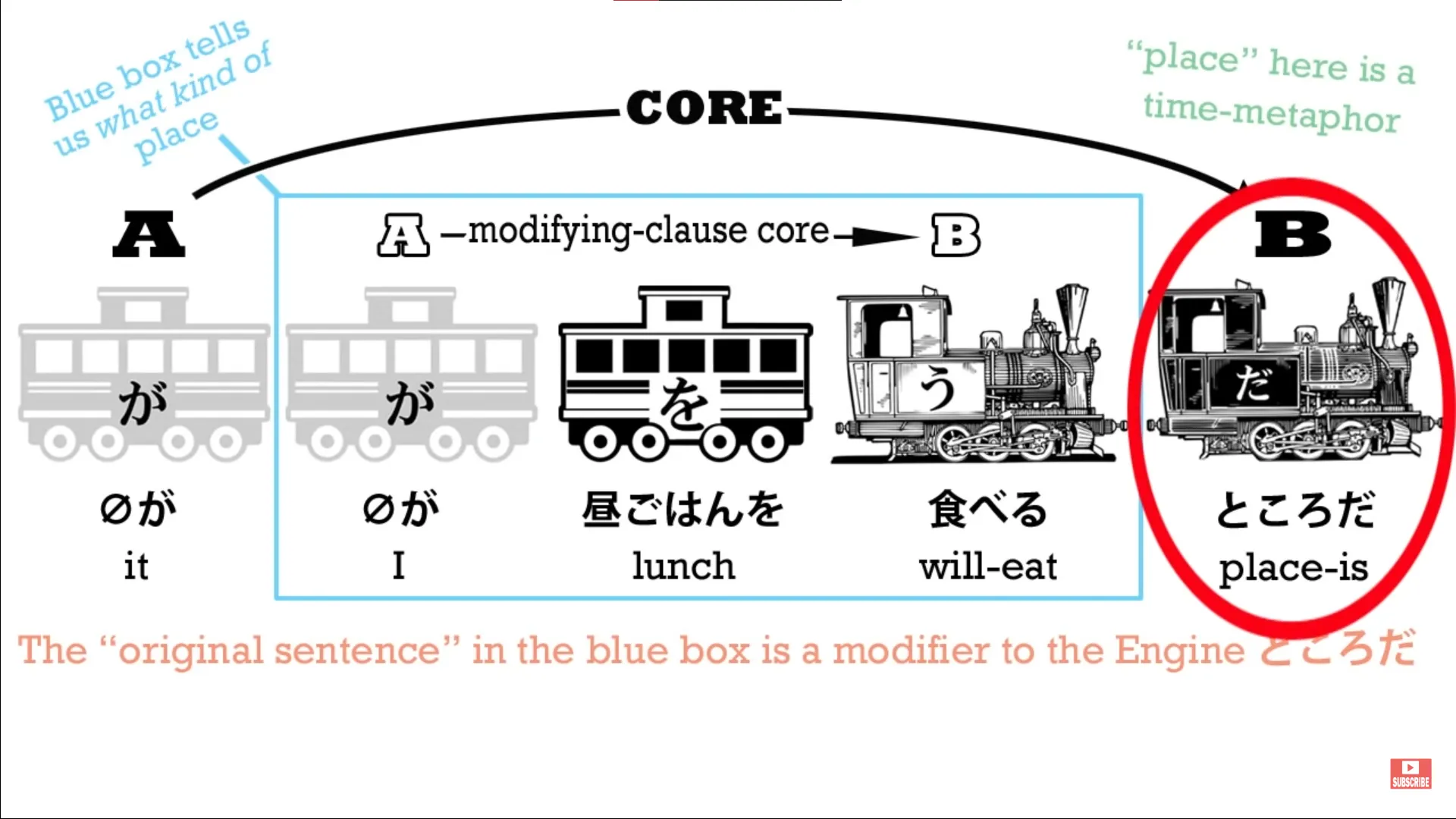 Et si nous comprenons cette analogie, nous pouvons comprendre certaines utilisations qui sont souvent expliquées sans en expliquer le fondement structurel, ce qui finit par vous donner simplement une liste de choses à mémoriser et, comme d'habitude, à dire « eh bien, ceci va avec cela et signifie cela, et nous ne savons pas particulièrement pourquoi ». Donc, par exemple, nous pouvons utiliser ところ