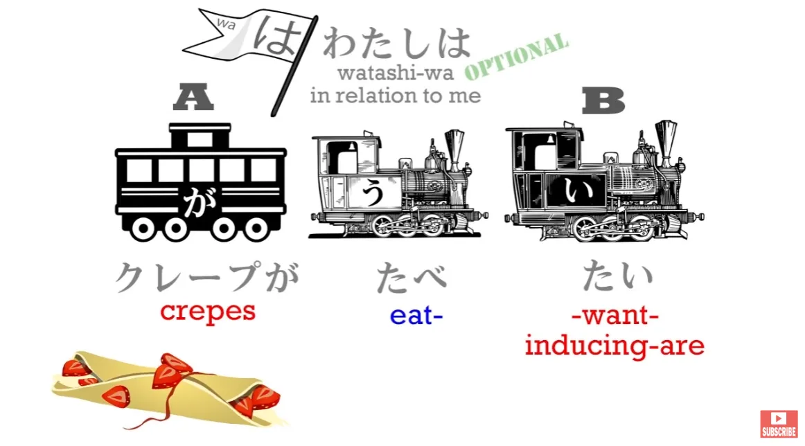 Le cœur de la phrase est la phrase et tout le reste est un appendice à l'un de ces deux éléments fondamentaux. Donc, avec *(私は)* クレープが食べたい