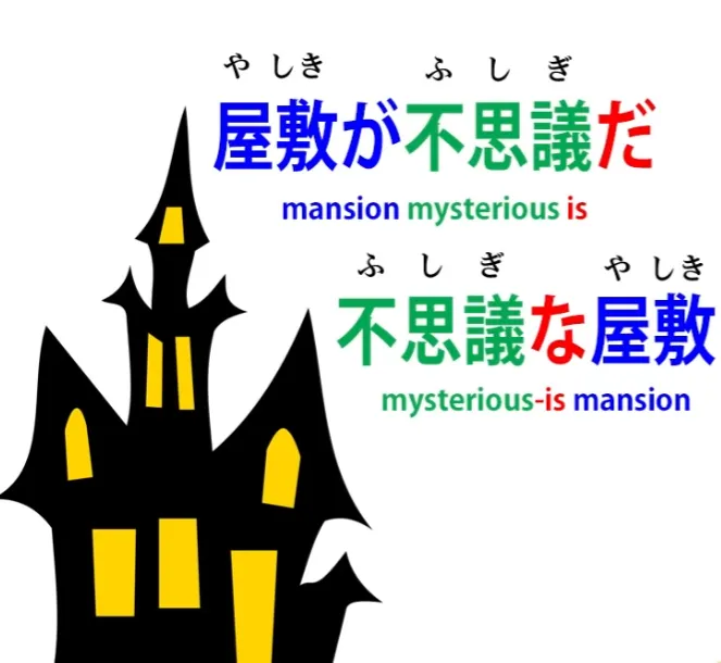 Et il peut être utilisé comme un nom adjectival, auquel cas il signifie quelque chose comme mystérieux. Donc si nous disons 不思議な屋敷