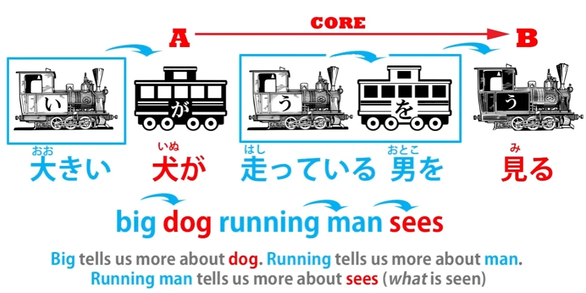 Et ceci est si crucial pour le japonais parce que c'est de cela que se compose chaque phrase que vous verrez, jamais de toute votre vie : un A-[voiture] marqué par が et un moteur B. Perturbez cela et vous avez tout perturbé. Ainsi, l'acteur de 本が読める