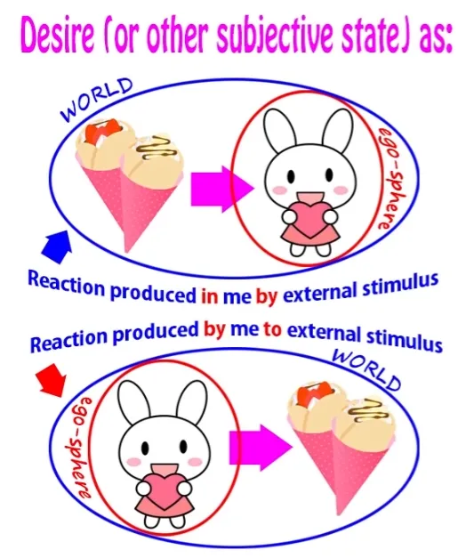 L'action de désirer, de craindre ou de vouloir, etc. subjectivement, est quelque chose qui se passe entre les deux, entre l'inducteur et celui qui expérimente. Et nous pouvons le regarder sous l'une ou l'autre perspective et cela n'a pas vraiment d'importance.
