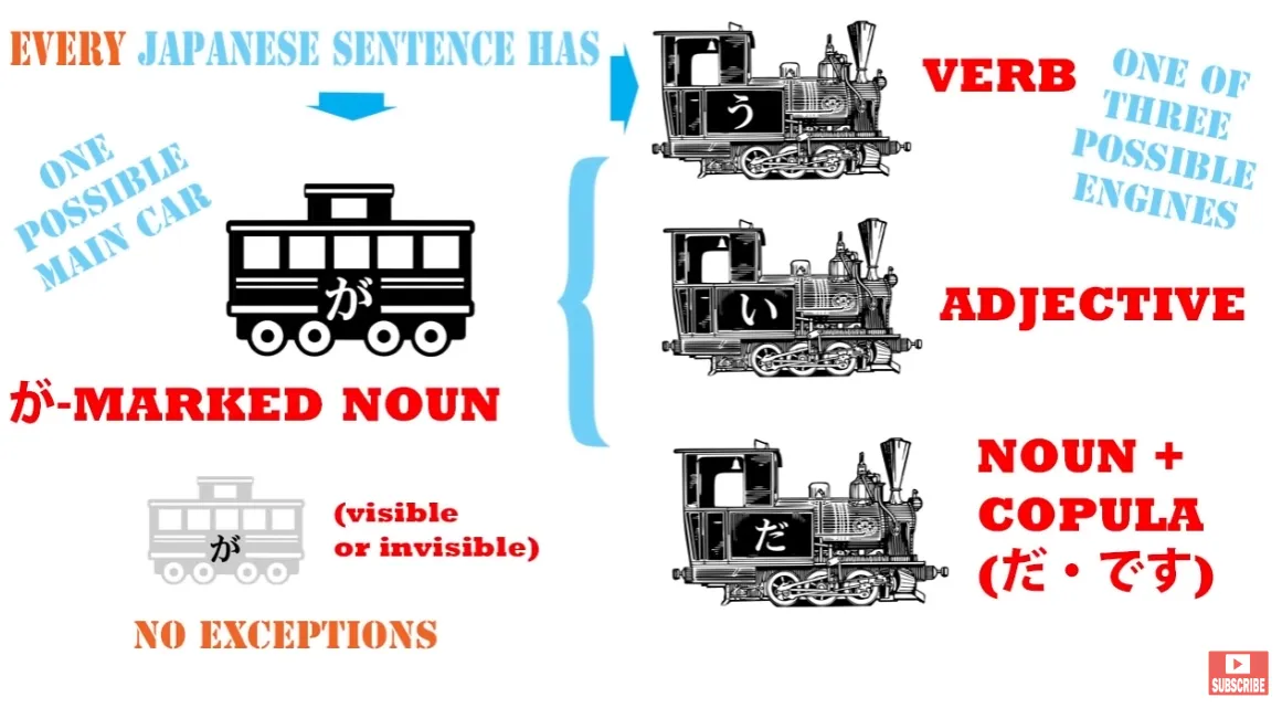 Et ces deux éléments, le moteur et le sujet marqué par が (ou voiture principale), sont le cœur de toute phrase. Ce sont les seules choses dont nous avons besoin dans une phrase. Nous devons avoir ces deux-là, et tout le reste dans une proposition logique nous en dit plus soit sur le moteur, soit sur la voiture marquée par が. Il ne peut rien faire d'autre.