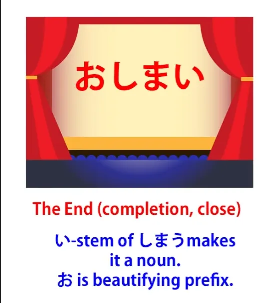Ainsi, si jamais vous écoutez des contes de fées japonais, vous constaterez qu'ils se terminent souvent par la formule おしまい