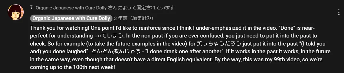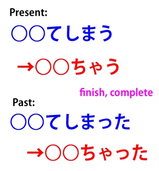 , qui sont attachées à la fin des verbes. Maintenant, si nous regardons les explications conventionnelles, nous lirons que cela indique une action qui a été terminée ou achevée, ou une action que nous regrettons ou que nous avons faite par accident, ou quelque chose qui vient de se produire de manière inattendue. Ils n'ajoutent généralement pas à cela que cela peut également indiquer quelque chose qui s'est produit qui était très bon, ou que cela peut en fait être utilisé au futur comme -ちゃう