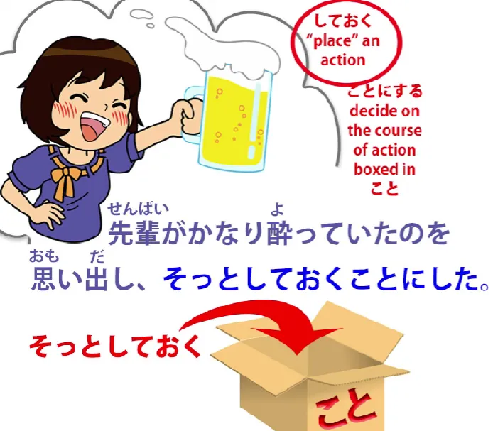 Elle dit donc essentiellement ici, faire ce qu'elle a à faire, mettre son action en place, tranquillement. そっとしておくことにした : or, ことにする, comme nous l'avons également couvert dans une leçon précédente, signifie décider de faire. Donc, cette dernière partie signifie elle décida de mettre son action tranquillement en place, littéralement.