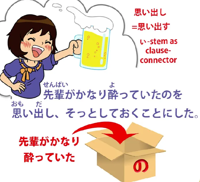 思い出す est se souvenir ; 思い出し, encore une fois, comme nous l'avons discuté la semaine dernière^[7.5], est la racine en い de 思い出す — se souvenir — et la racine en い ici (le し) est utilisée comme la forme en て pour faire de cette proposition une partie d'une phrase composée.