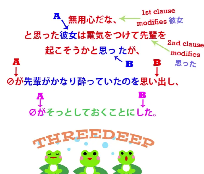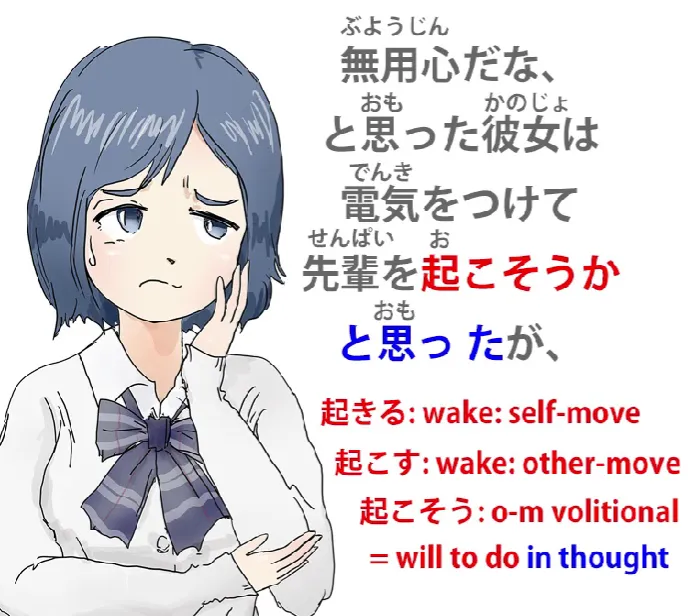 Très bien, cela a l'air un peu compliqué et nous n'avons toujours pas terminé la phrase, mais prenons-la morceau par morceau. Tout d'abord, elle a pensé 無用心 — comportement dangereux, peu sûr ; elle pensa — と思った彼女 — elle qui pensait cela, pensa ensuite à autre chose ; 電気をつけて — 点ける / つける, bien sûr, est la version faire bouger l'autre de 点く / つく, alors elle pensa à allumer les lumières ; 先輩を起こそう — or, comme nous le savons, cette terminaison そう est une terminaison volitionnelle ; 起こそうか — elle pensa à prendre l'action de réveiller le senpai.