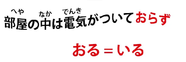 Alors pourquoi est-ce おらず ? Eh bien, c'est parce que, tandis que いる, comme nous le savons, est un verbe ichidan (à un étage), おる, se trouve être un verbe godan (à cinq étages). Donc, comme pour tous les verbes godan, l'auxiliaire négatif est attaché à la racine en あ.