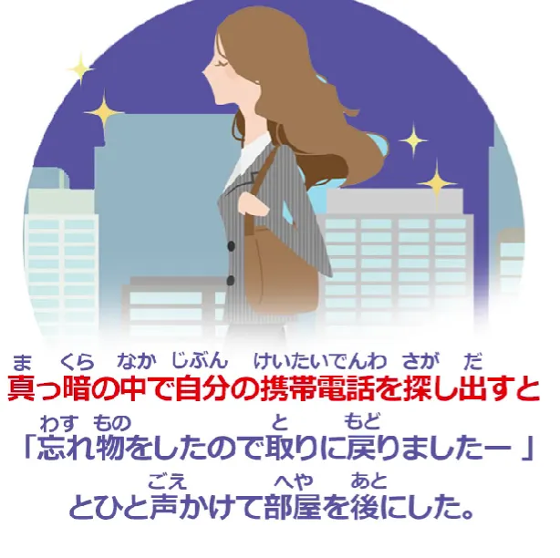 Pour vous rappeler où nous en étions à la fin de la leçon de la semaine dernière, notre héroïne s'était rendue à une fête bien arrosée dans l'appartement de son senpai (aîné). Après avoir quitté la fête et être rentrée chez elle la nuit, elle a réalisé qu'elle avait laissé son 携帯電話 (téléphone portable) dans l'appartement du senpai. Elle est donc revenue, a sonné, mais il n'y a eu aucune réponse, a tourné la poignée de la porte et a constaté qu'elle n'était pas verrouillée.