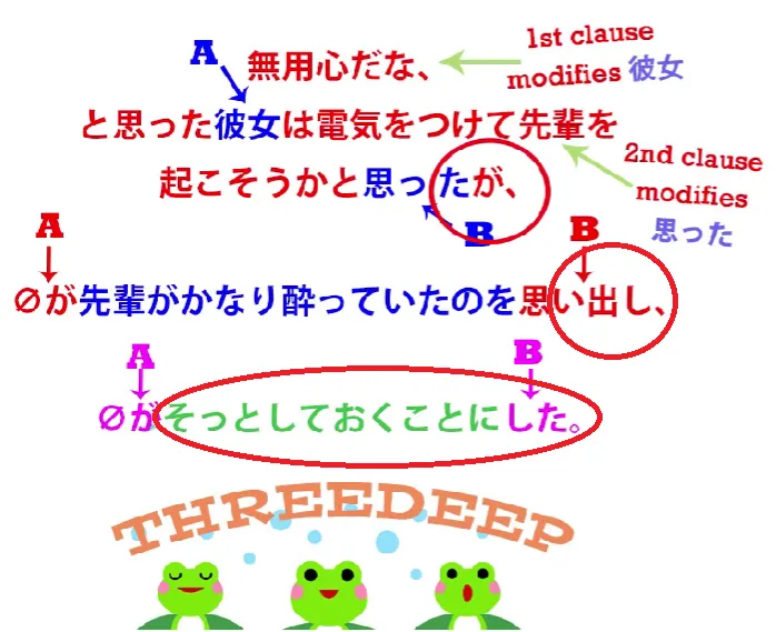 C'est ce qu'elle a pensé, mais... (が — mais) 先輩がかなり酔っていたのをおもいだし、. Alors, かなり est un autre de ces noms adverbiaux qui peuvent modifier un verbe ou un adjectif sans le に ou と qui est habituellement nécessaire à un nom pour modifier un verbe ou un adjectif, donc かなり酔っていた — 酔う est être malade ou être ivre, dans ce cas ivre.