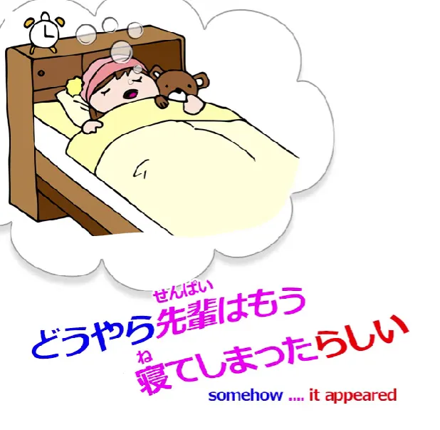 Donc, entre ce sandwich qui nous donne le sens de il apparaît que c'est le cas, il est dit 先輩はもう寝てしまった — le senpai était déjà allé dormir / s'était déjà couché. Comme nous le savons, ce しまう, しまった donne ce sens d'action faite ou terminée. Et c'est vraiment la meilleure façon de le dire en français.