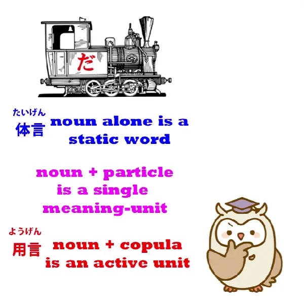Maintenant, l'autre chose à comprendre est que lorsque nous attachons la copule à un nom, cette combinaison est en fait un 用言 ou une unité active.