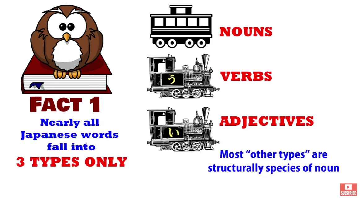 Comme je l'ai dit précédemment, presque tous les mots japonais se divisent en trois types, à savoir les noms, les verbes et les adjectifs.