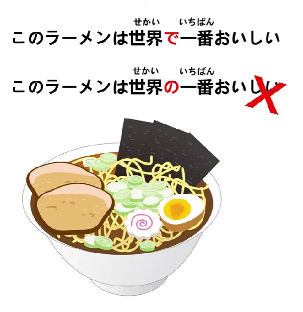 Maintenant, nous pouvons aussi dire 世界の一番美味しいラーメン (Sekai no ichiban oishii rāmen). C'est moins couramment dit, mais cela pourrait être dit. Et ce que cela signifie, c'est le ramen le plus délicieux du monde, mais le point à comprendre ici est que で trace les limites du 用言, l'élément actif, le verbe ou dans ce cas l'adjectif ; の fait quelque chose de différent.