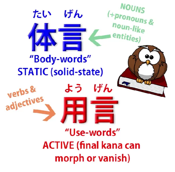 Cependant, il existe une autre façon de diviser les mots japonais qui est utilisée dans la grammaire japonaise et c'est en 体言 et 用言, ce qui signifie littéralement mots-corps et mots d'usage, mais les termes que je vais employer sont mots statiques ou éléments statiques et mots actifs ou éléments actifs.