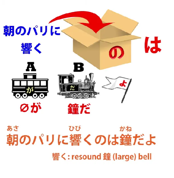 Et puis bien sûr, nous devons avoir un sujet logique marqué par が qui a été défini pour nous par ce の. Donc, ce qui résonne dans le Paris matinal, ce sont (ou c'est) des cloches, よ (yo - particule d'emphase).